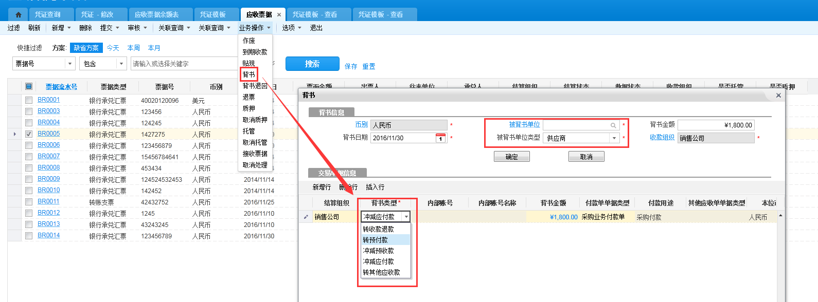 9、应收票据的背书、背书退回、退票等操作需要考虑结算组织与收款组织是否一致,以上均是在结算组织与收款组织一致下生成的凭证情况,若不同会有其他应收/其他应付科目处理结算组织与收款组织之间的往来;